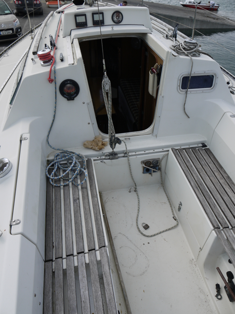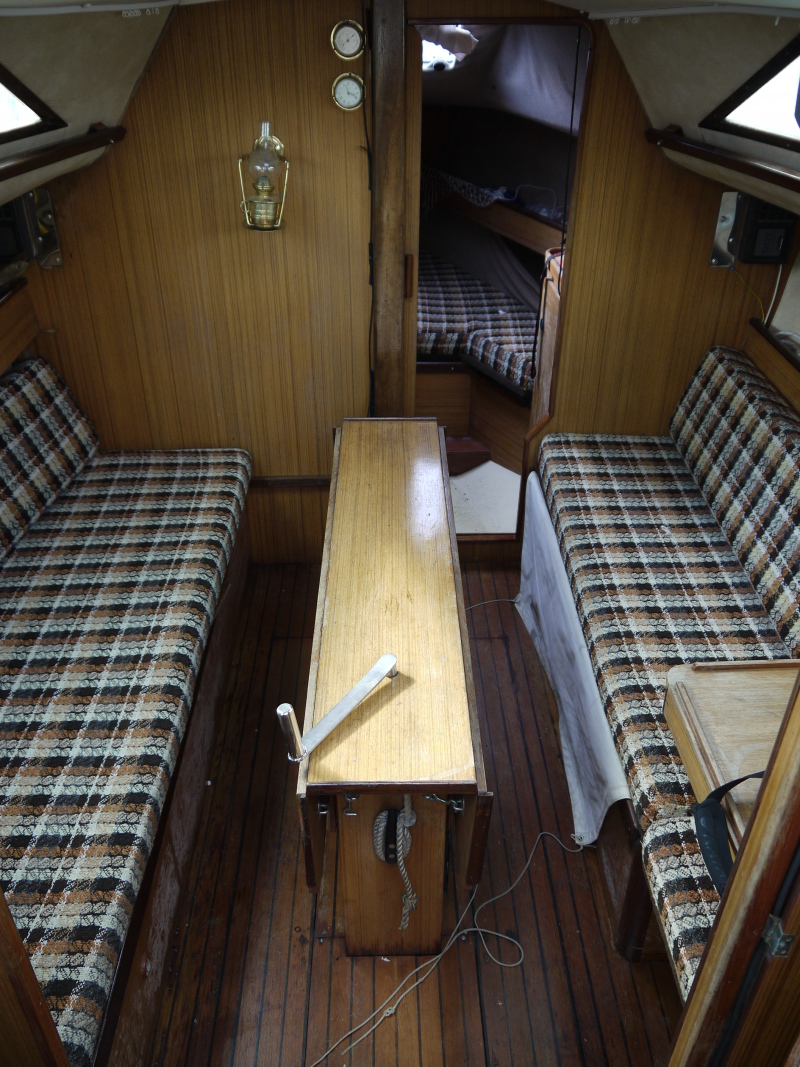 GRP lifting keel,transom hung solid mahogany spade rudder,self draining cockpit. Volvo MD7diesel 13.5 hp engine(serviced by engineer) single lever control in cockpit. Fuel tank 5.5 gls. 12 volt battery. 4 berths in two cabins,headroom 5' 11".Fully enclosed heads(new toilet) with handbasin and footpump.Galley area with gimballed gas cooker,two burners ,grill and oven.Sink with footpump,gas bottle in cockpit draining overboard.Folding chart table,dining table with folding leaves,centreplate winch under.Eberspacher heating.Bulkhead compass,Yeoman chart plotter,Seatalk ST 50,Seatalk log/boatspeed.nav. lights etc. Manual & electric bilge pumps,horseshoe buoy,Danbuoy with bracket.Aluminium mast and boom,slab reefing main,roller furling genoa, lewmar winches etc.( all lines to cockpit) stainless steel rigging,stainless steel stern boarding ladder,stainless steel pulpit,pushpit & staunchions with double stainless steel guard wires,two anchors plus chain,various fenders,warps etc spare parts. Draft- Keel up,.78m/2'6". Keel down,1.73/5'7" Restored sprayhood.Yard trailer included