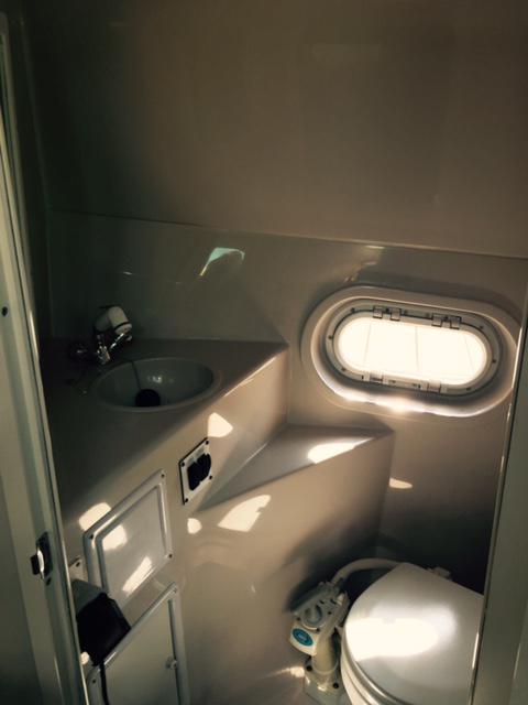 Aft to starboard is the toilet compartment with Jabsco ITT toilet which drains into a holding tank. There's a sink and shower plus low level storage. A full length mirror is fitted to the back of the toilet door.