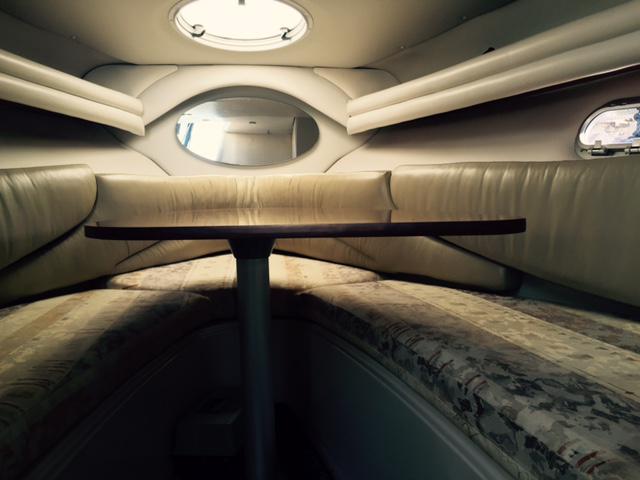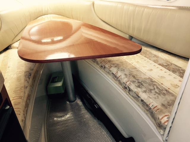 Storage lockers are located under the front berth. A pedestal-mounted table is fitted in the centre. An escape hatch is located above this berth.