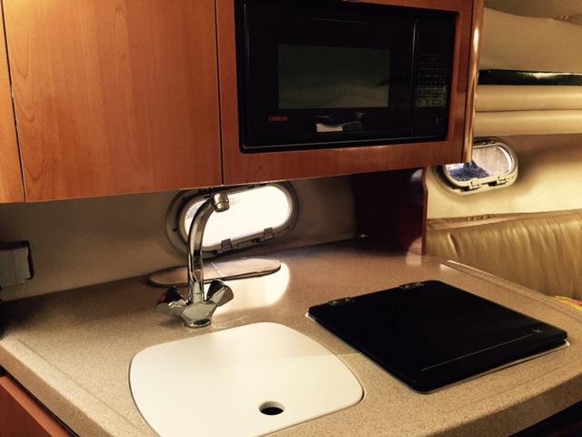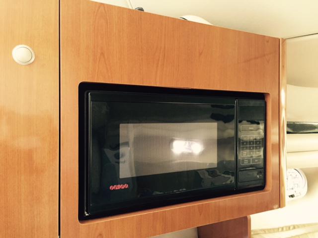 The galley features a moulded sink and a single-burner alcohol/240v electric hob which are both set into the work surface. An Origo microwave is sited above and the Norcold electric fridge below. Good storage in the galley cupboards.